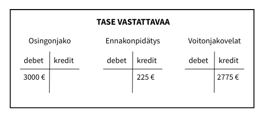 Yritys maksaa osakkaalle osinkoja 3000 euroa, joista ennakonpidätystä on 225 euroa. Pidätyksen jälkeen osakkaan pankkitilille kilahtaa (3000 – 225) 2775 euroa.