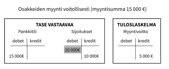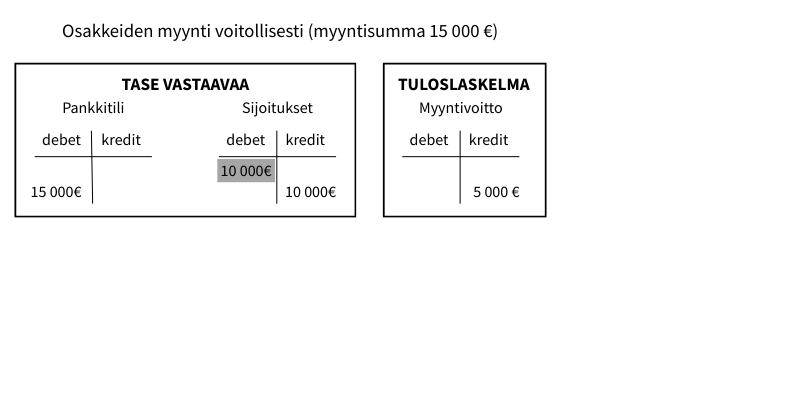 Jos esimerkin osakkeet joskus myydään, kirjataan myynti myös kahdessa osassa. Myynti on yritykselle liikevaihtoa.