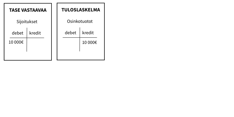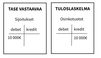 💡Osinkotuottojen  loppusijoituspaikka on siis vaihto-omaisuus, mutta koska sitä ei voida suoraan sinne kirjata, täytyy heittää mutka ostojen ja varastonmuutoksen kautta. Varastonmuutos vaikuttaa ostojen määrään joko lisäämällä tai vähentämällä sitä. Tässä tapauksessa ostojen ja varastonmuutoksen kirjaukset ”kumosivat” toisensa – eli osinkokirjaus ei vaikuta tuloslaskelman kulupuolella laisinkaan.