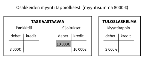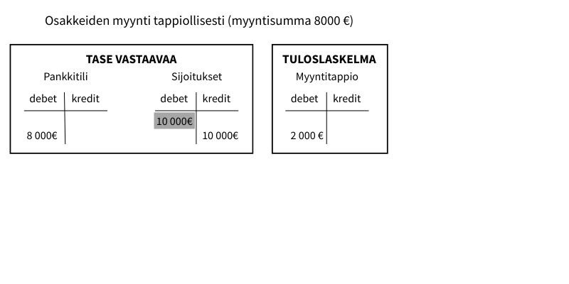 Jos osakkeet joskus myydään, kirjaus on pankkitilin debet ja pysyvien vastaavien sijoituksien kredit. Näin vastaavien sijoitukset-tili nollaantuu näiden osakkeiden osalta eikä ne enää ole kirjanpidossa. Usein kuitenkin osakkeet myydään eri hinnalla kuin ne on hankittu, ja siitä riippuen osakkeiden myyntihinta tuottaa joko myyntivoittoa tai -tappiota, joka täytyy ottaa huomioon kirjausta tehdessä.