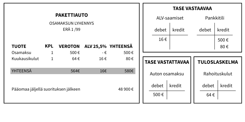 - (2682) Auton osamaksuvelka – Osamaksuerän määrä (500e) lyhentämään velkaa.